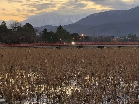 途中はもう夕暮れの風景。遠くの山に日が沈み、空は赤く染まりました。
