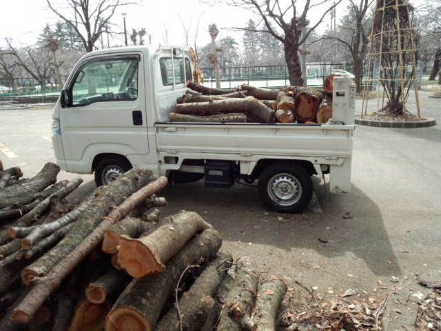 近くの高田公園で伐採された木をいただきました・・薪ストーブやボイラーのために。もう来冬の準備開始です。