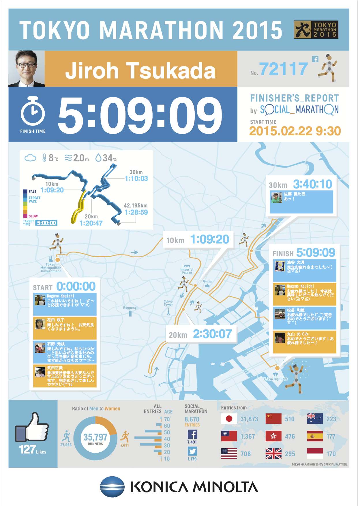 スタートから10キロおき、そしてゴールの時間を計測してくれます。さらにそれが、リアルタイムにツイッターやフェイスブックに投稿されます。