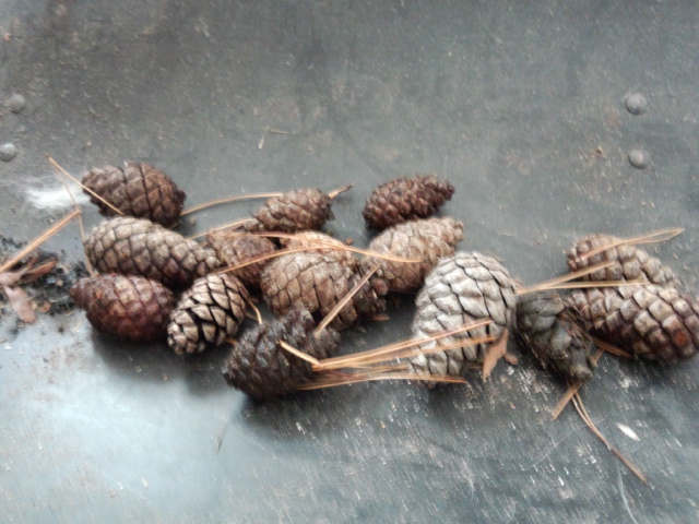 お散歩の目的がもう一つ・・松ぼっくり拾いです。薪ストーブに焚きつけにちょうどいいんです。自然の物で、しかもタダ。最高です(^_^)v