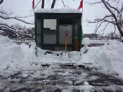 明日は燃えるゴミの収集日。小屋の前にできた雪山をのけてきました。