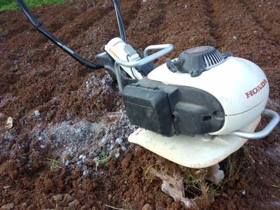 これはカセットボンベのガスで動く、可愛い耕運機。1年に1回だけの出番です。