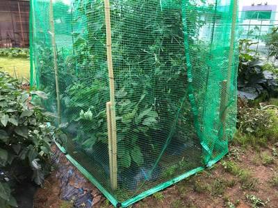 ヤられました(//∇//) キューリが3本に、ミニトマトが数個。みな、良くできているものばかり。ネットで覆ったのに、その隙間から侵入したようです。
